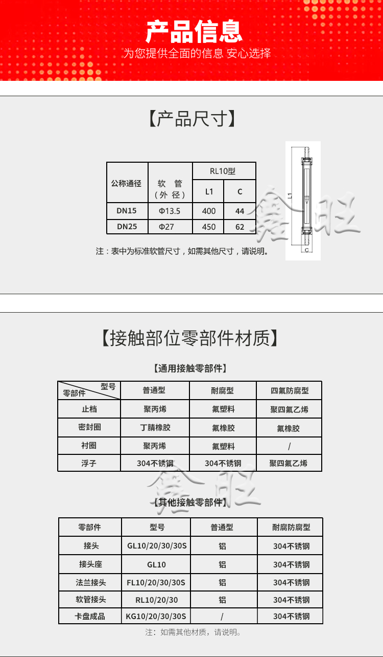 GL/RL/FL10、20、30型玻璃轉(zhuǎn)子流量計的連接有管螺紋(GL10、20、30型)、軟管(RL10、20、30型);法蘭(FL10、20、30型)三種方式。其耐壓和耐溫均高于原有相同通徑的LZB/LZJ系列玻璃轉(zhuǎn)子流量 計產(chǎn)品;分普通型(測量一般無腐蝕流體)和耐腐型(測 量的腐蝕性流體)兩種。產(chǎn)品體積小、結(jié)構(gòu)輕巧,外形 美觀,維修方便、安全可靠,安裝簡單。FL10、20、30型 法蘭可轉(zhuǎn)動,與現(xiàn)場管道法蘭孔吻合。